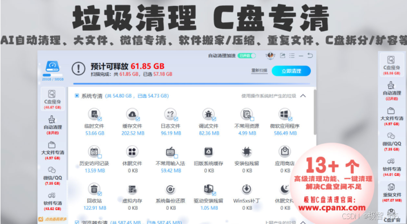 搜索文件过程中,如果速度太慢,可能是电脑垃圾文件过多,导致检索文件出现卡顿 ,文件系统响应速度变慢,可以点击文章尾部的官网链接卡片 ,前往其官网并使用极智C盘清理软件的系统垃圾清理功能来清理缓存垃圾文件,保持系统干净清爽,远离搜索卡顿。