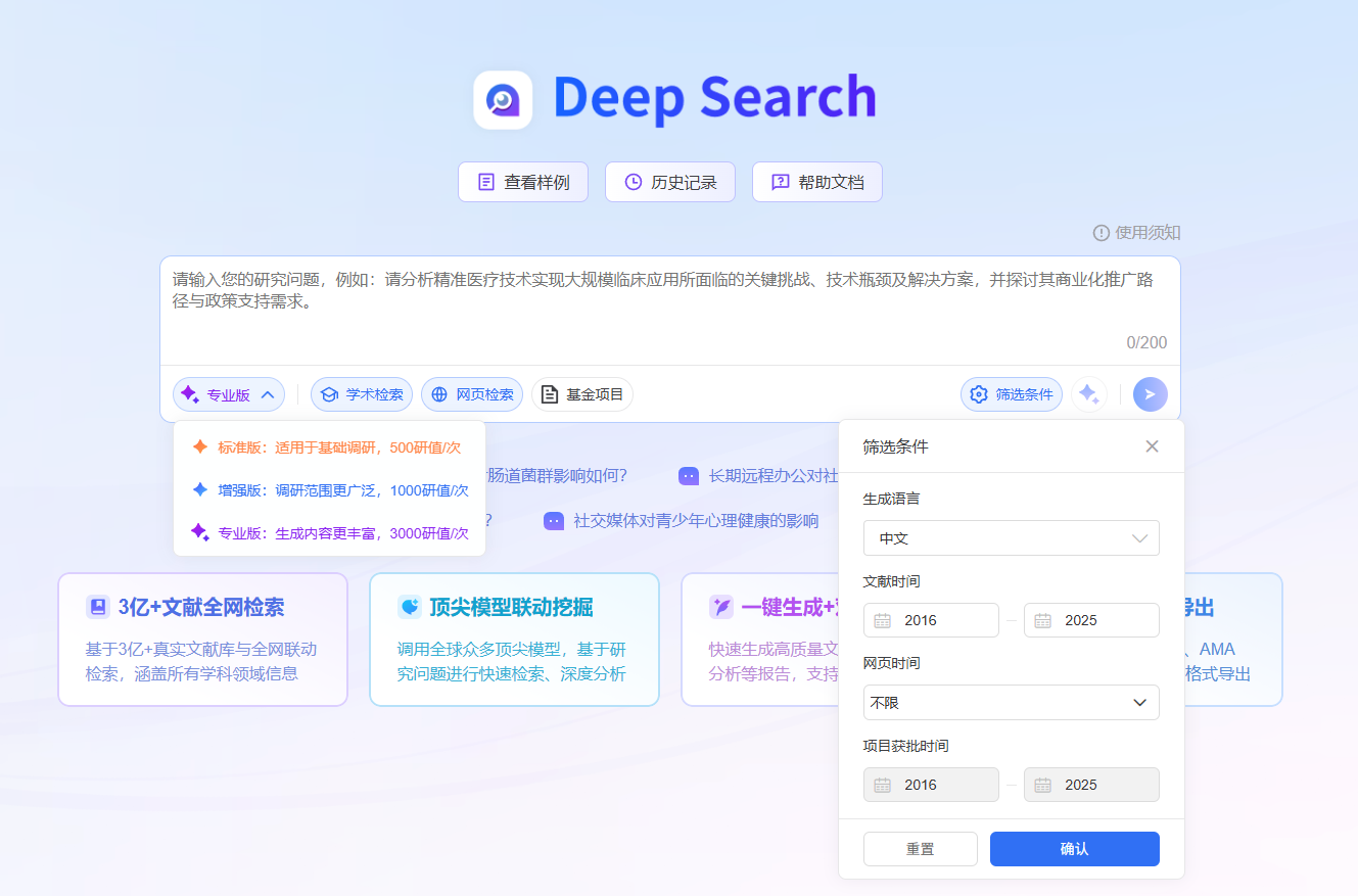 - Deep Search :你可以像请教一位资深同行一样,直接用自然语言提出完整、复杂的问题 。例如: