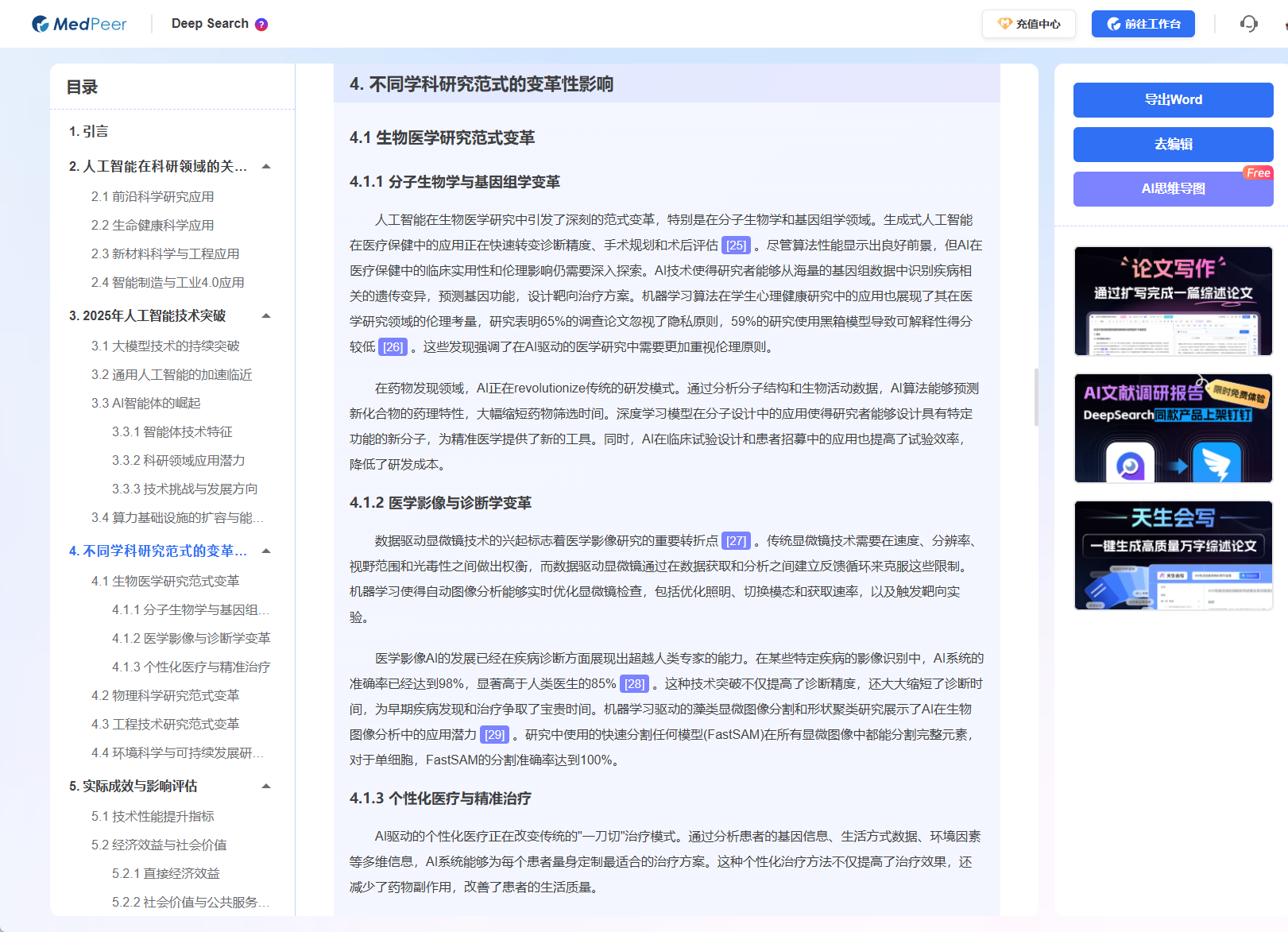 - Deep Search输入:"请系统梳理2025年人工智能在科研领域的关键应用场景、技术突破及实际成效,重点分析其对不同学科研究范式的变革性影响 "