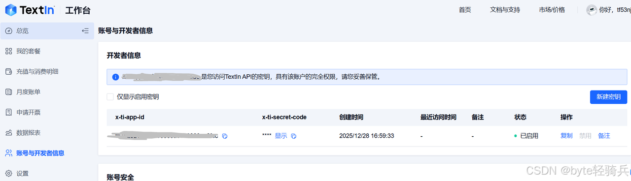 2. TextIn API 密钥 :访问 TextIn官网 注册账号,进入控制台创建API Key,保存好api_key和api_secret。