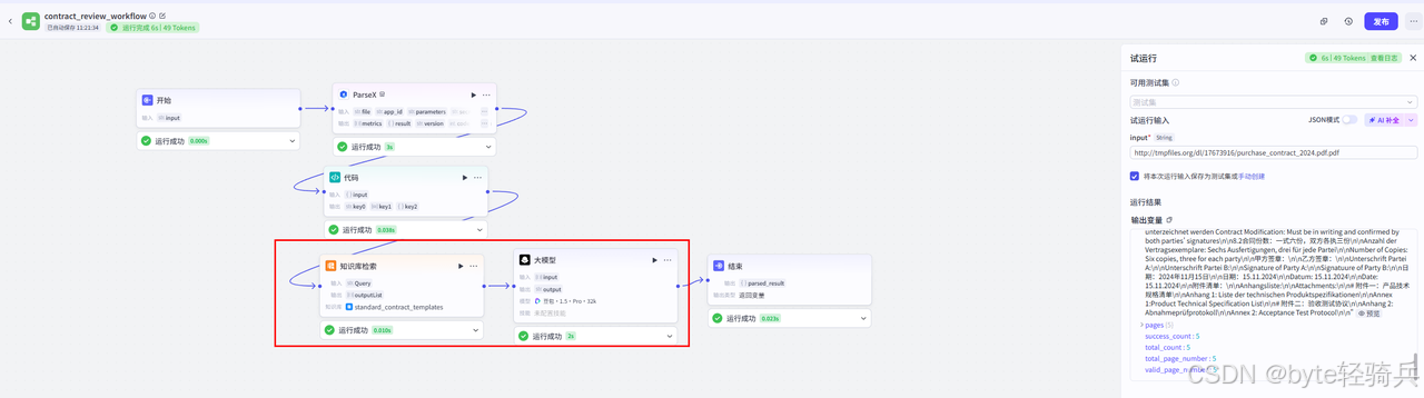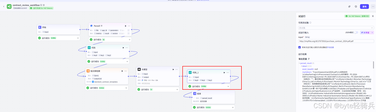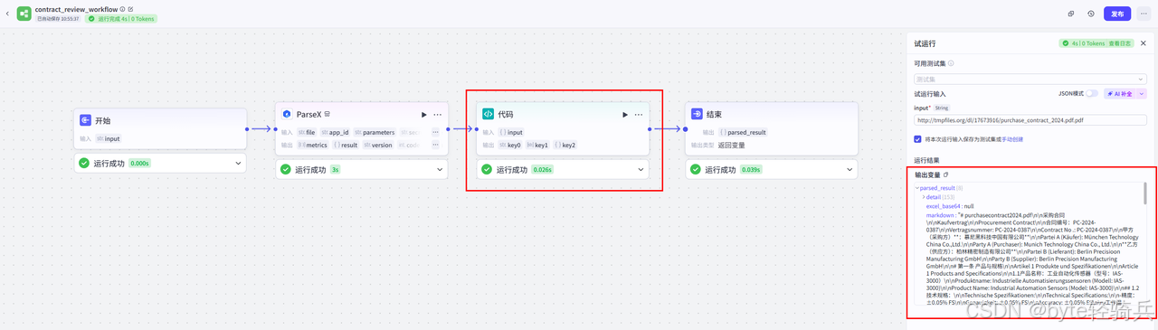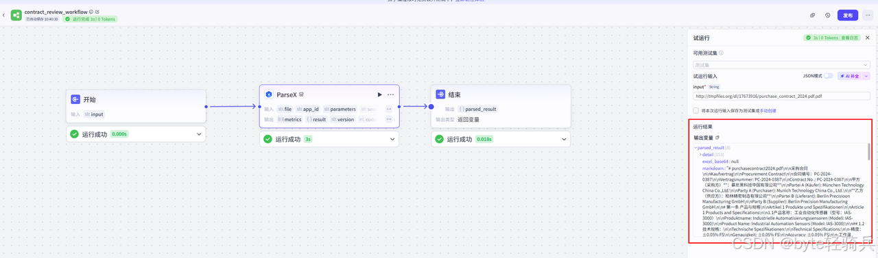 3. 测试解析:点击节点右上角"测试",上传一个PDF合同,查看解析输出的Markdown是否包含表格和段落结构。