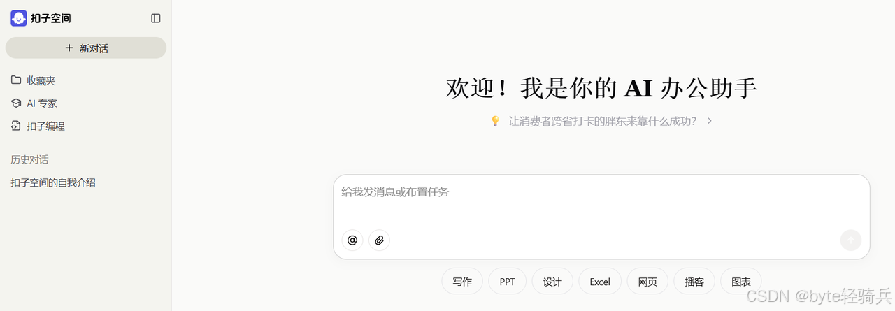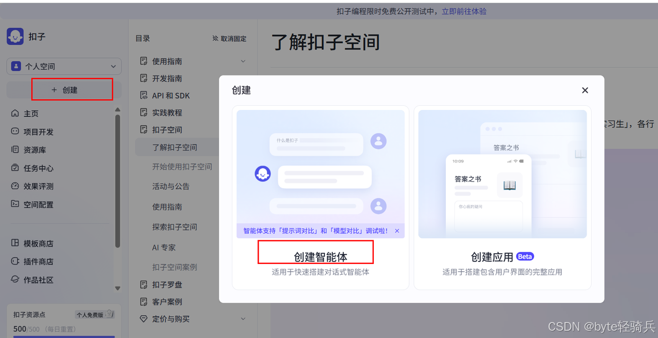 - 登录Coze平台https://www.coze.cn/open/docs/cozespace/overview,点击左上角"创建" → 选择"智能体"。