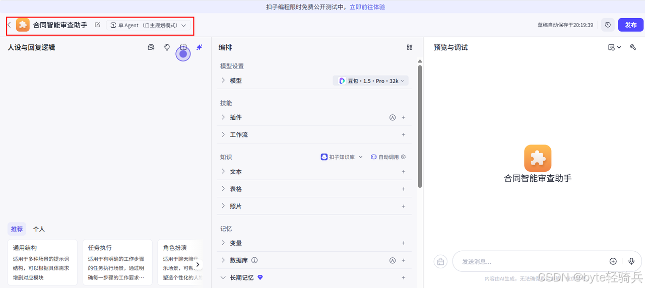 三、实战:在Coze平台搭建跨国采购合同审查Agent
