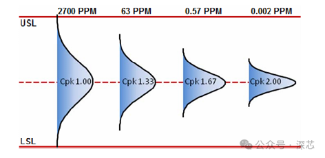在质量控制术语中,PPM 代表每百万颗芯片失效的数量。在短期意义上,一个过程可能具有中心化的正态分布,并具有双侧规格(上规格限 / 下规格限)且无Sigma偏移,Cpk 与 PPM 之间的关系如图所示。