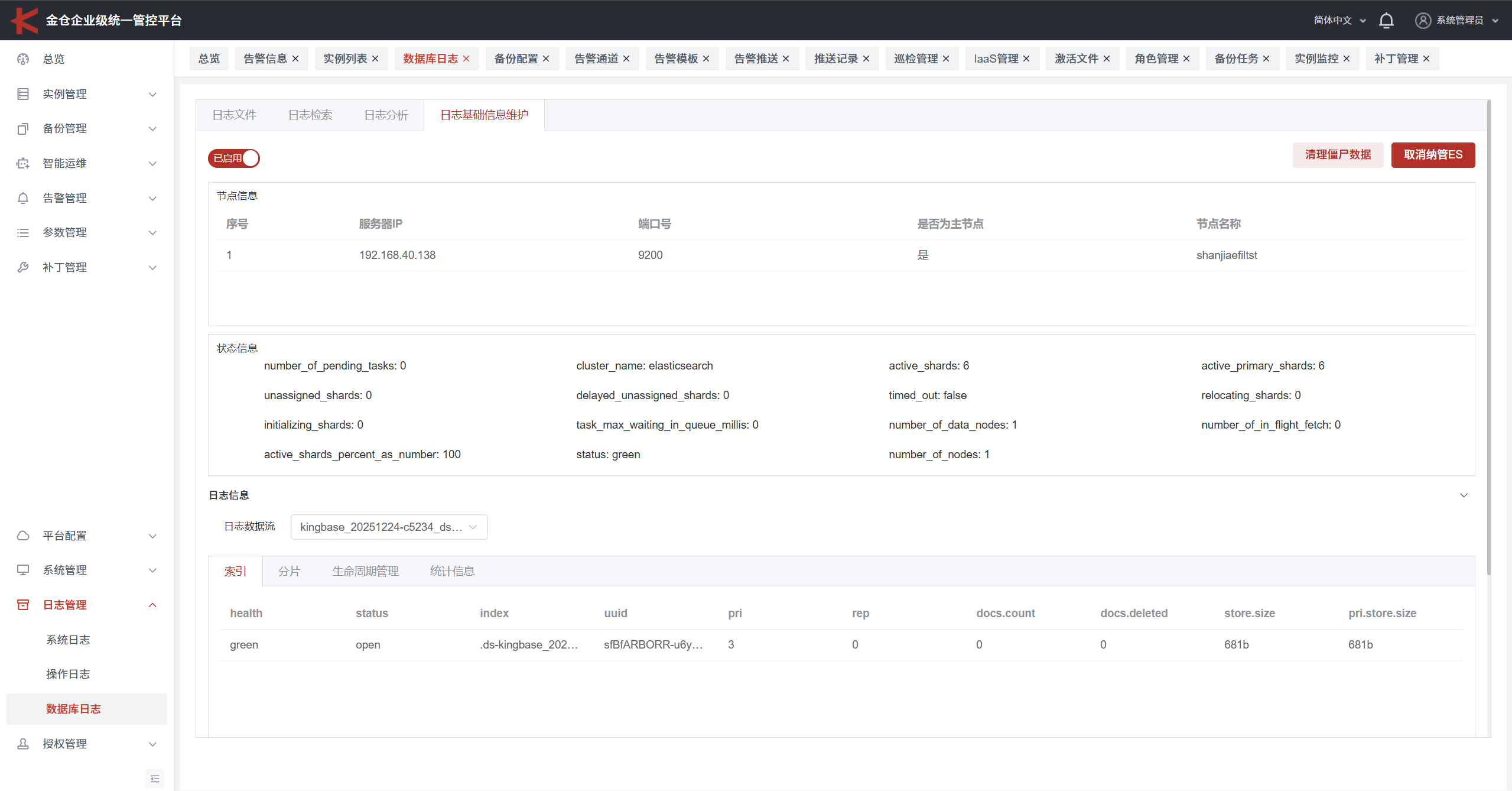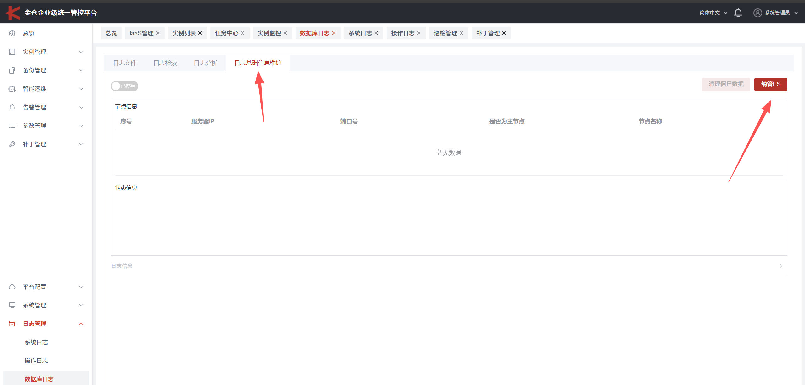 前面说过了,如果要开启日志检索功能,就需要额外纳管接入ES了,选择日志基本信息维护--新增
