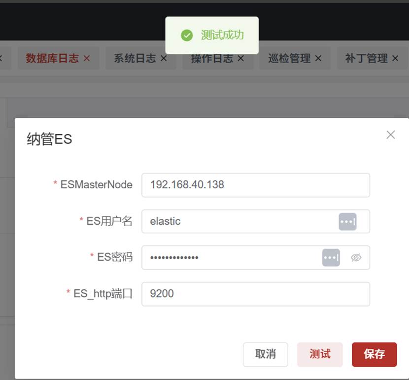 添加进入ES信息,IP地址,账号密码,以及端口,点击测试。