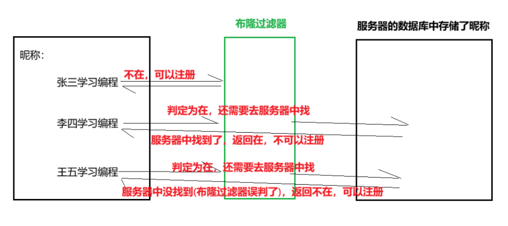 上述在网页中注册昵称的时候就可以用布隆过滤器进行过滤,如果判定为昵称不在,那就一定不在,就不用再去服务器中查找了,但是如果判定为在,可能是误判了,仍要去服务器中查找,但起码过滤了部分数据,网络请求的代价还是很高的,布隆过滤器可以提高效率