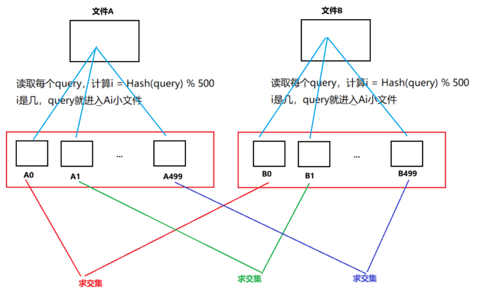 既然文件太大无法直接读到内存,那么我们可以先将大文件切分成小文件,而切分的方法采用的是哈希切割,也就是对于每个 query 字符串,进行哈希映射,决定 query 进入哪个小文件,文件A和文件B中相同的query进入的必然是同一个下标的文件(采用的是同样的哈希函数),因此求交集的时候只需要求 A0 和 A1 的交集,B0 和 B1的交集... 等即可,每次只需要将 A0 & B0 加载到内存,使用 两个set 求交集即可,A1 & B1 依次类推...