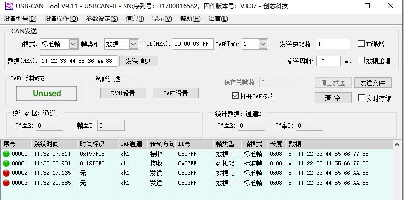 # 发送(标准帧,数据帧,ID:7ff,date:11223344556677)