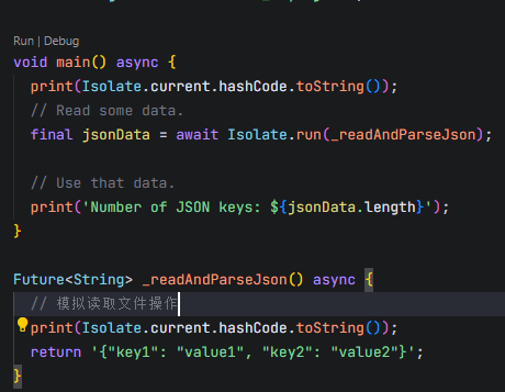_readAndParseJson () 是一个现有的异步函数,它完全可以直接在主隔离区中运行。而使用 Isolate.run () 来运行它则能够实现并发。工作隔离区完全抽象了 _readAndParseJson () 的计算过程。它可以在不阻塞主隔离区的情况下完成运行。
