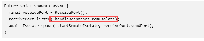 接着为接收端口添加监听器,以处理工作者Isolate将传回的响应消息。传递给监听器的回调函数 _handleResponsesFromIsolate 将在第4步详细说明。