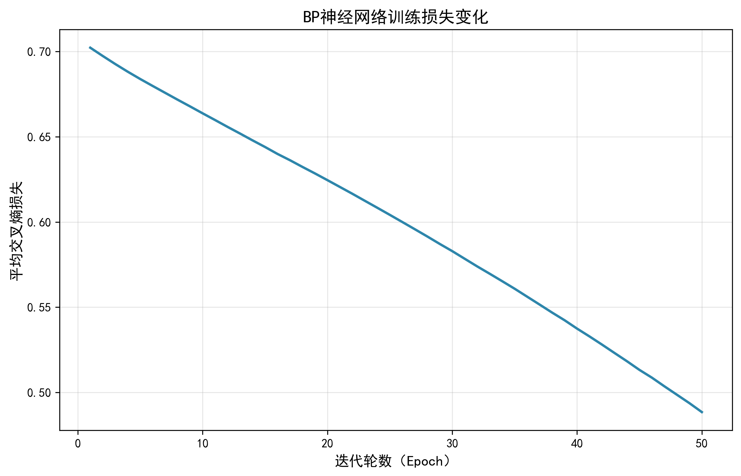 numpy:手动实现 BP 神经网络的核心(矩阵运算、梯度计算);jieba:中文文本分词(解决中文无天然分隔符的问题);os:读取文本文件(路径处理);warnings:屏蔽无关警告(提升运行体验)。