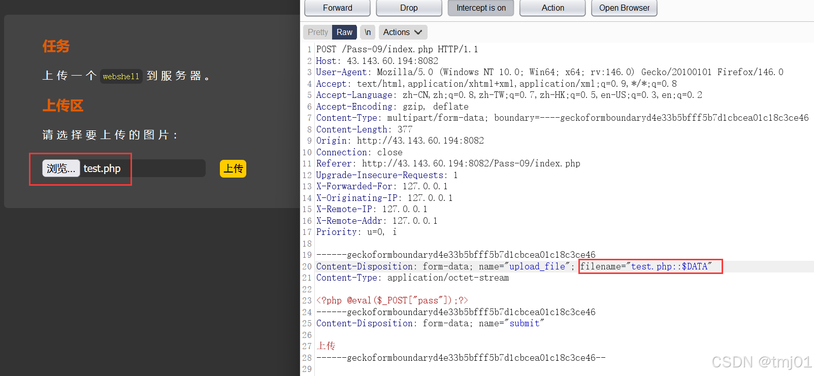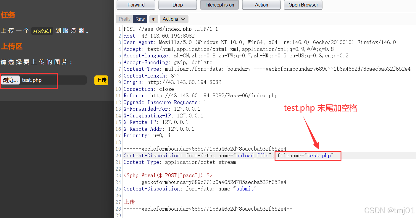 1.Bp抓包,将文件名改为 test.php (末尾加 空格)