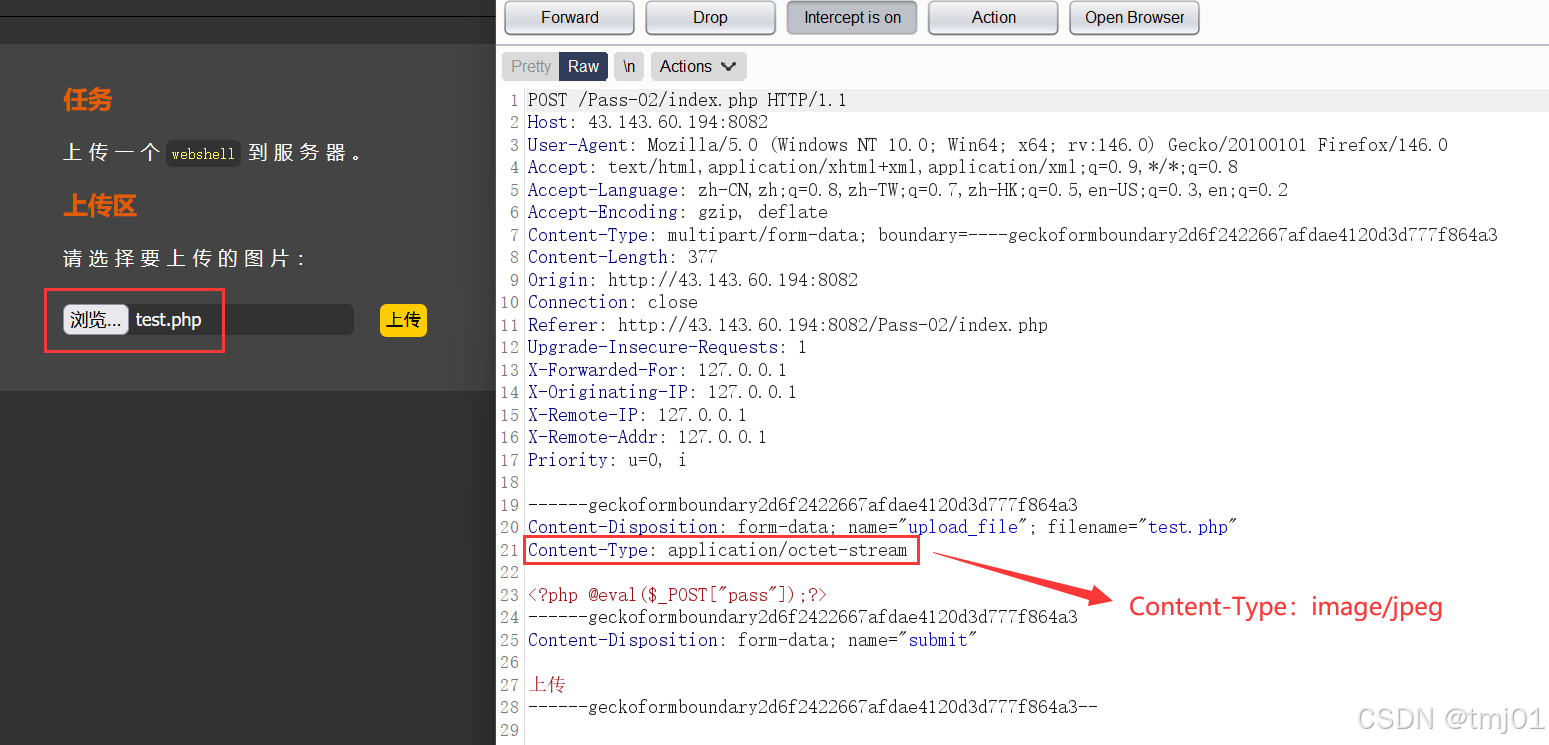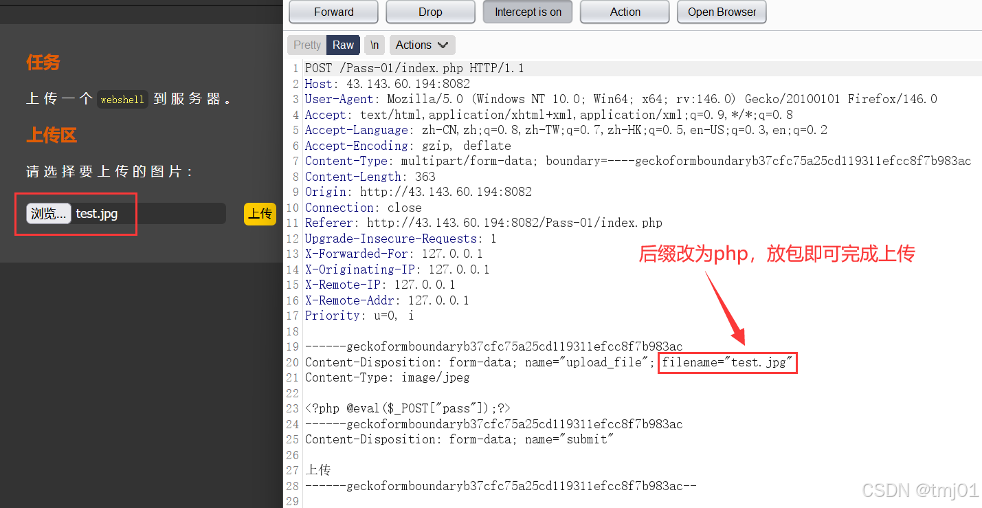 方法2: 抓包改后缀:将 php 木马先改后缀为 jpg上传,Bp抓包改回 php 放包即可