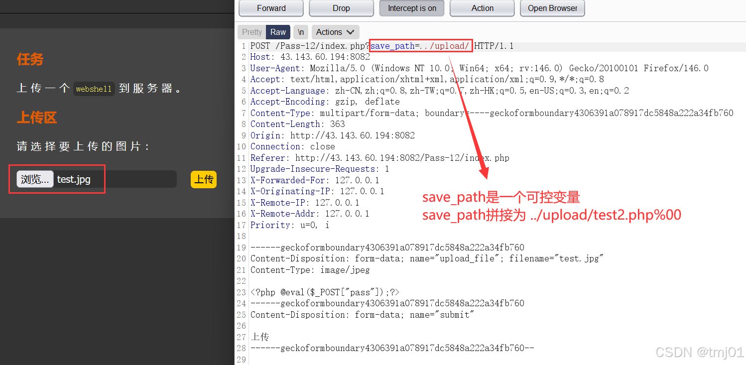 上传 test.jpg 抓包,修改保存路径为 test2.php%00 (此处php文件名任意)