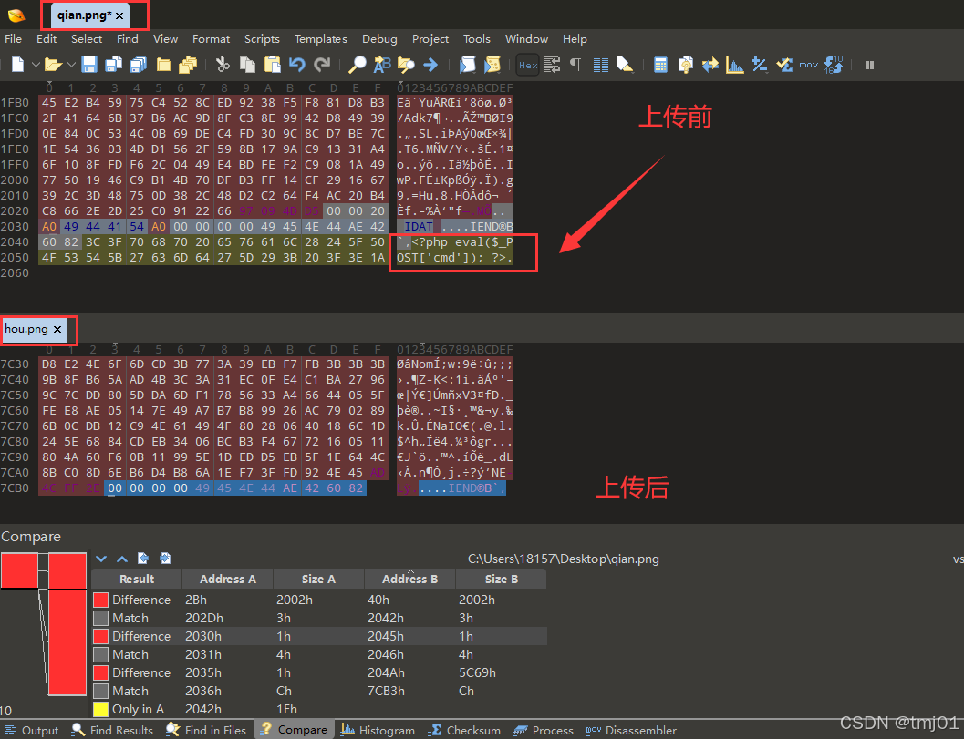 上传前后对比发现,上传的图片马已被渲染,上传前插入的代码消失不见了,找到上传前后不变的部分插入代码,生成新的图片马再上传即可