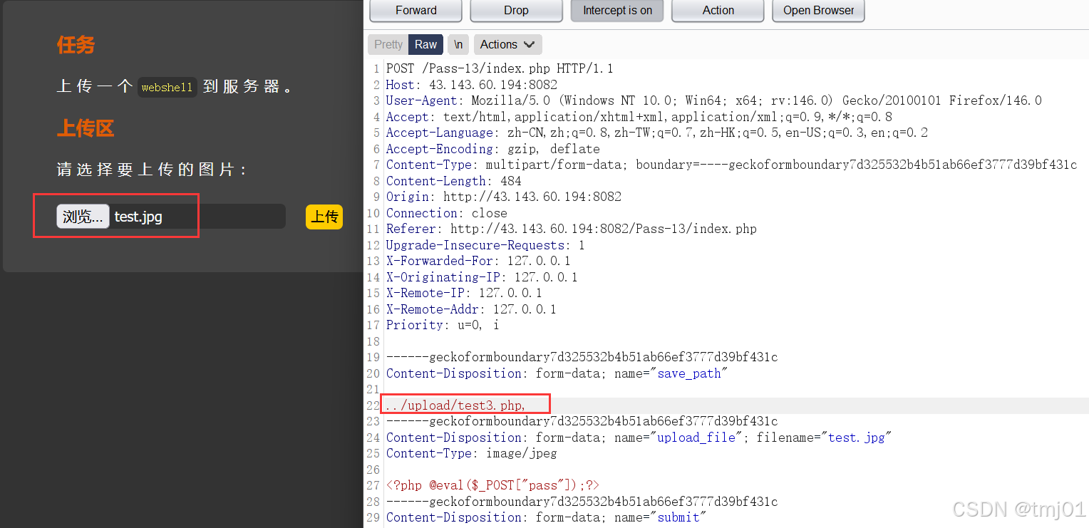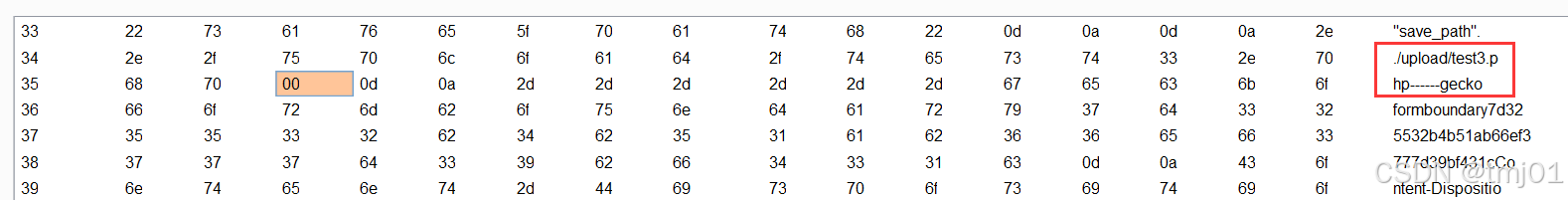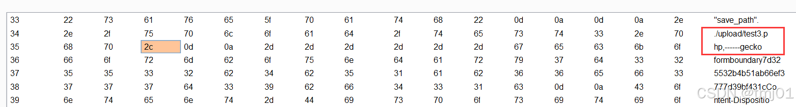 1.上传 test.jpg 抓包,在请求体中找到文件保存路径,修改为 test3.php, (加逗号是为了方便查找十六进制的位置)
