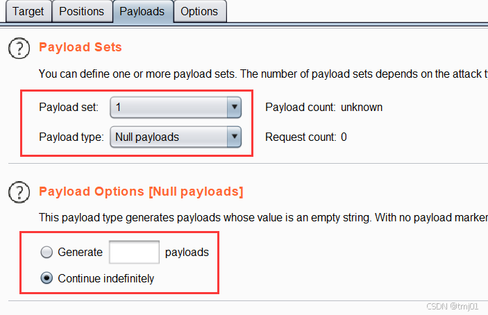 上传test.php,BP抓包发送到 Intruder模块,Clear删除标识,在Payload中选择Null payload,再勾选Continue indefinitely,表示无限期地访问,开始攻击