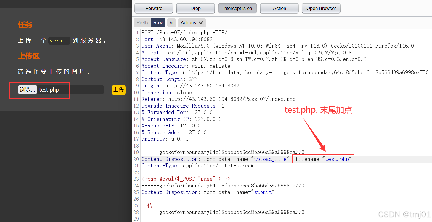 1.Bp抓包改文件名为 test.php**.,(末尾加点**)