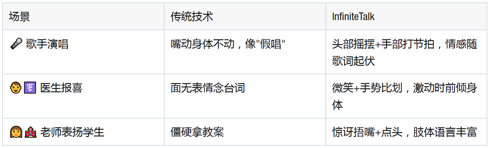 美团视觉智能部研发的InfiniteTalk彻底颠覆规则!它把配音从"嘴部修复"升级为"全身电影级生成",核心突破在于: