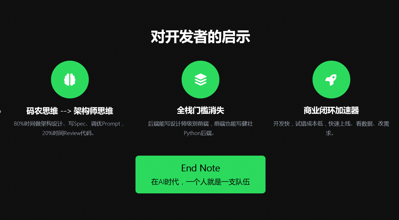 过去我们往往把大部分精力投入到代码实现上,而现在,思考如何构建系统、如何用 Prompt 与模型对话、如何定义需求 成为核心竞争力。开发者需要从"写代码的工匠"转变为"系统的设计师",把握全局、规划路径,才能在 AI 赋能的环境中保持领先。