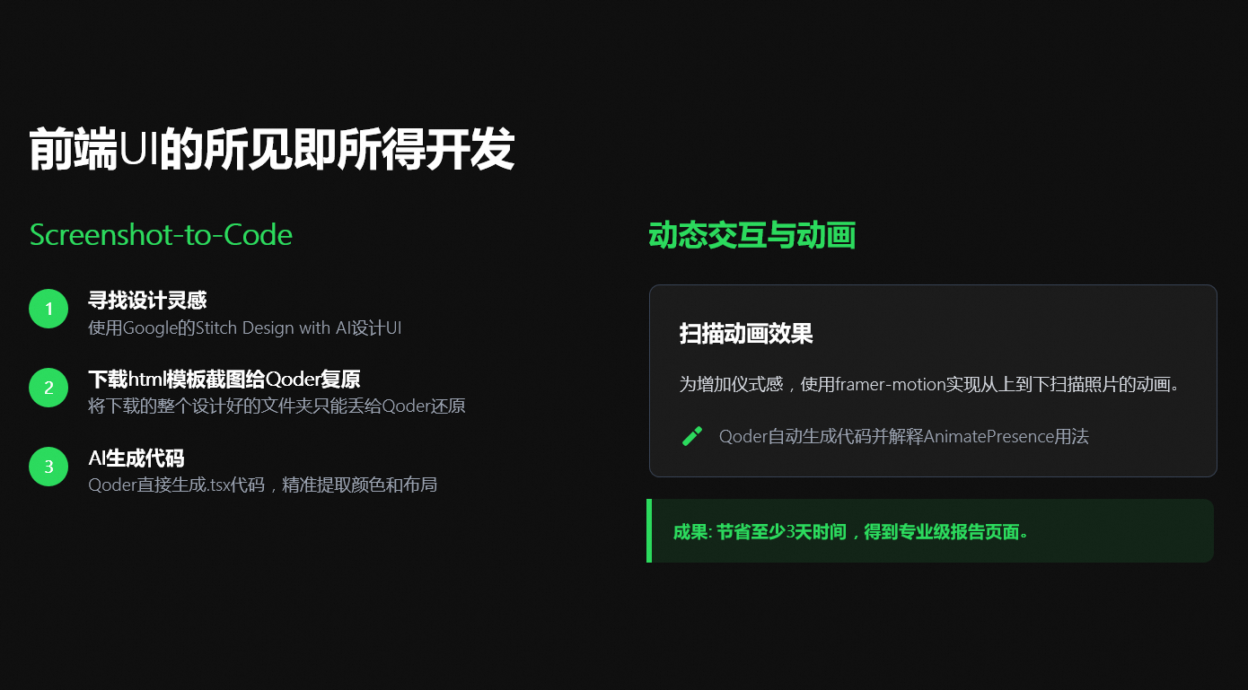 前端:通过 Google 的 Stitch AI 设计工具生成 UI,全选下载,然后丢给 Qoder 还原,Qoder 能 1:1 还原设计稿,连交互逻辑都自动生成!