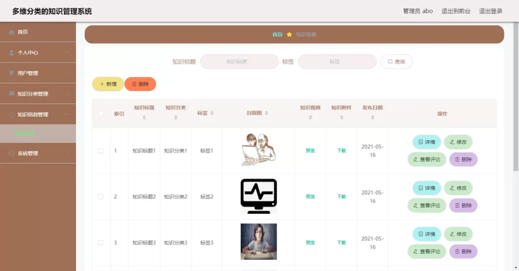 在知识爆炸与信息过载的时代,如何对海量知识进行结构化组织、高效检索与智能管理,已成为企业、教育机构乃至个人提升认知效率的关键。为帮助 JavaWeb 学习者构建具备高内聚、低耦合特性的专业级知识库项目,幽络源源码网特别推出 SpringBoot 114 基于多维分类的知识管理系统 源码。该系统采用 SpringBoot + Vue 前后端分离架构,创新性地引入"多维分类"机制(如按主题、行业、难度、来源等多标签组合),突破传统单分类局限,支持知识条目的精细化归档与灵活查询,界面简洁、逻辑严谨,是毕业设计中展现数据建模与信息架构能力的优质选题。