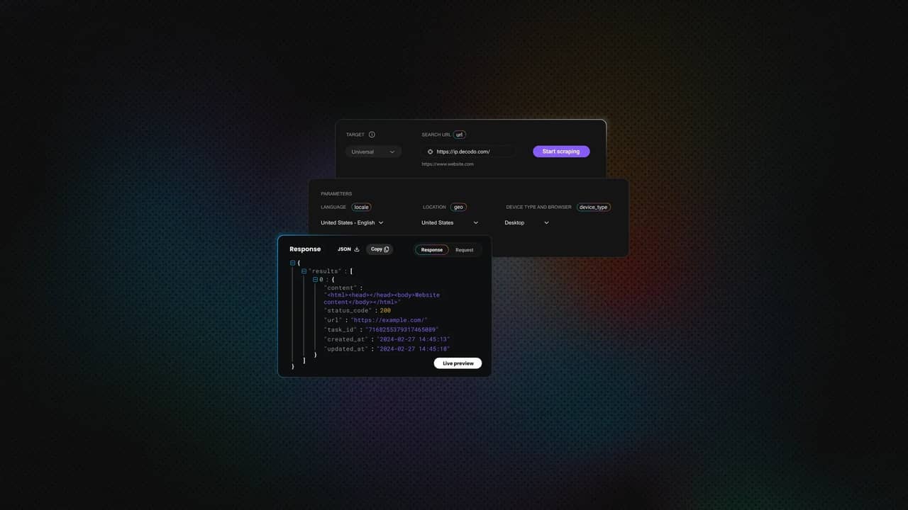 Decodo 网页抓取API处理我们刚刚构建的复杂性。你不必自己管理会话、重试和解析器,而是向API发送请求,它处理基础设施。