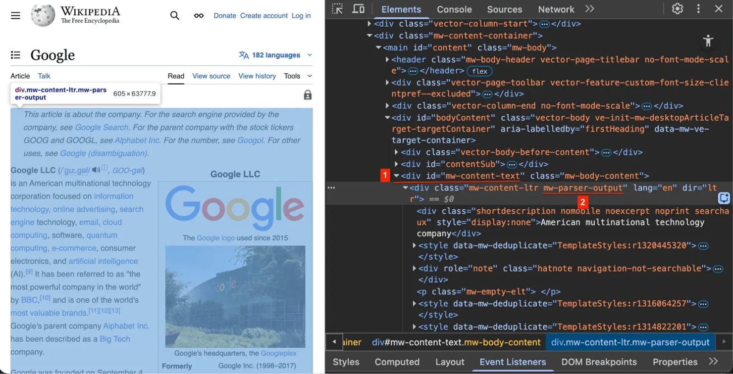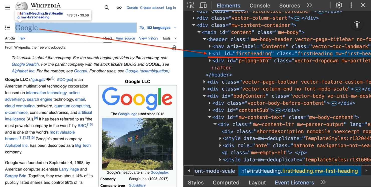 右键单击任何维基百科页面并选择"检查元素"(或在Windows上按F12 / Mac上按Cmd+Option+I)。你将看到以下关键结构元素: