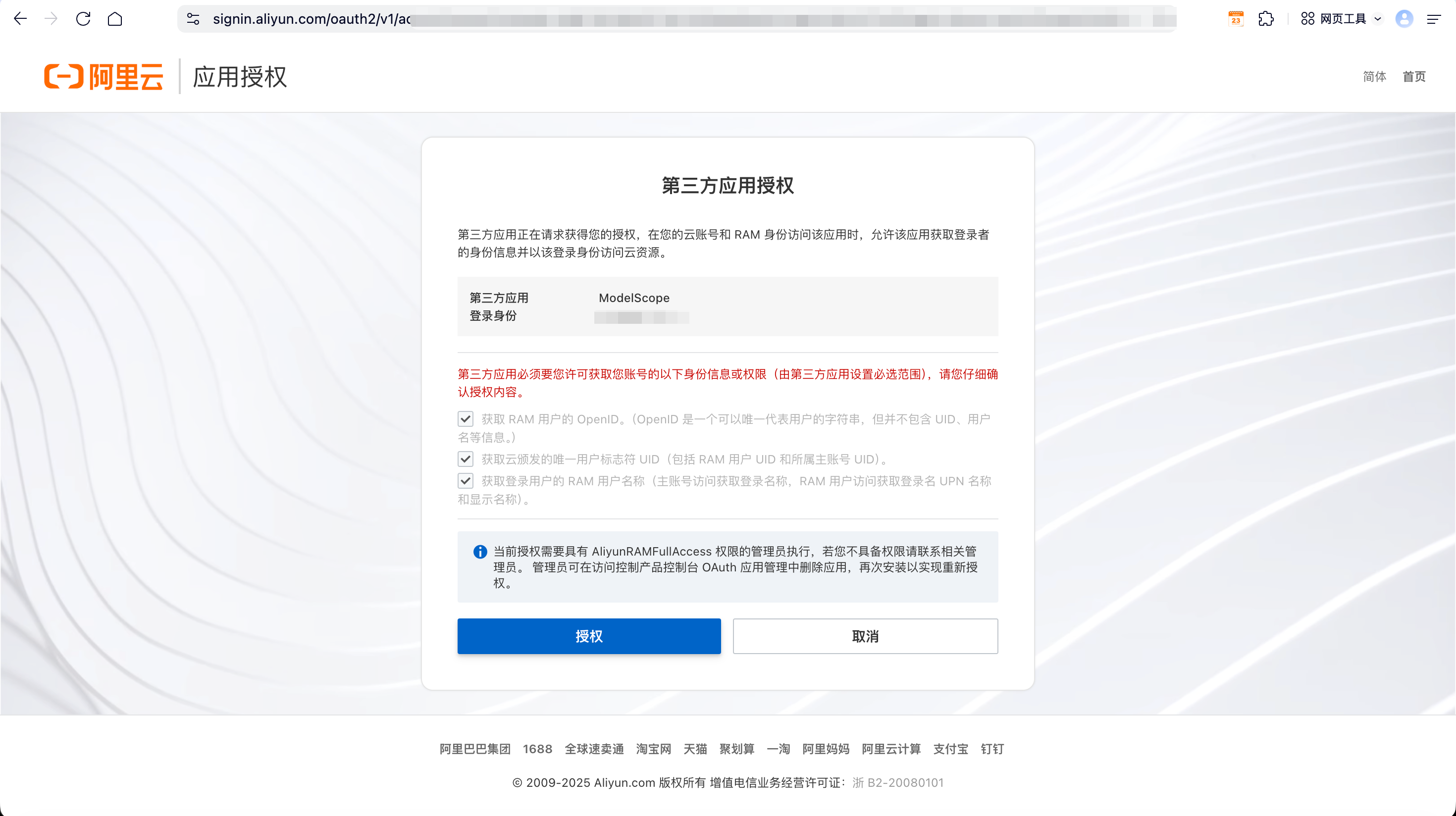 然后就会跳转到阿里云平台。如果你之前已经注册并登录了,就直接进入授权页面。如果没有注册过,或者没有登录过,可以先注册然后登录。国内平台注册登录都非常方便,没有任何难度。注册阿里云平台之后,也是找到右上角的头像。点击账号。进入到这里个人实名信息。进行个人认证。认证完成之后 ,就可以开始正式使用魔搭社区。