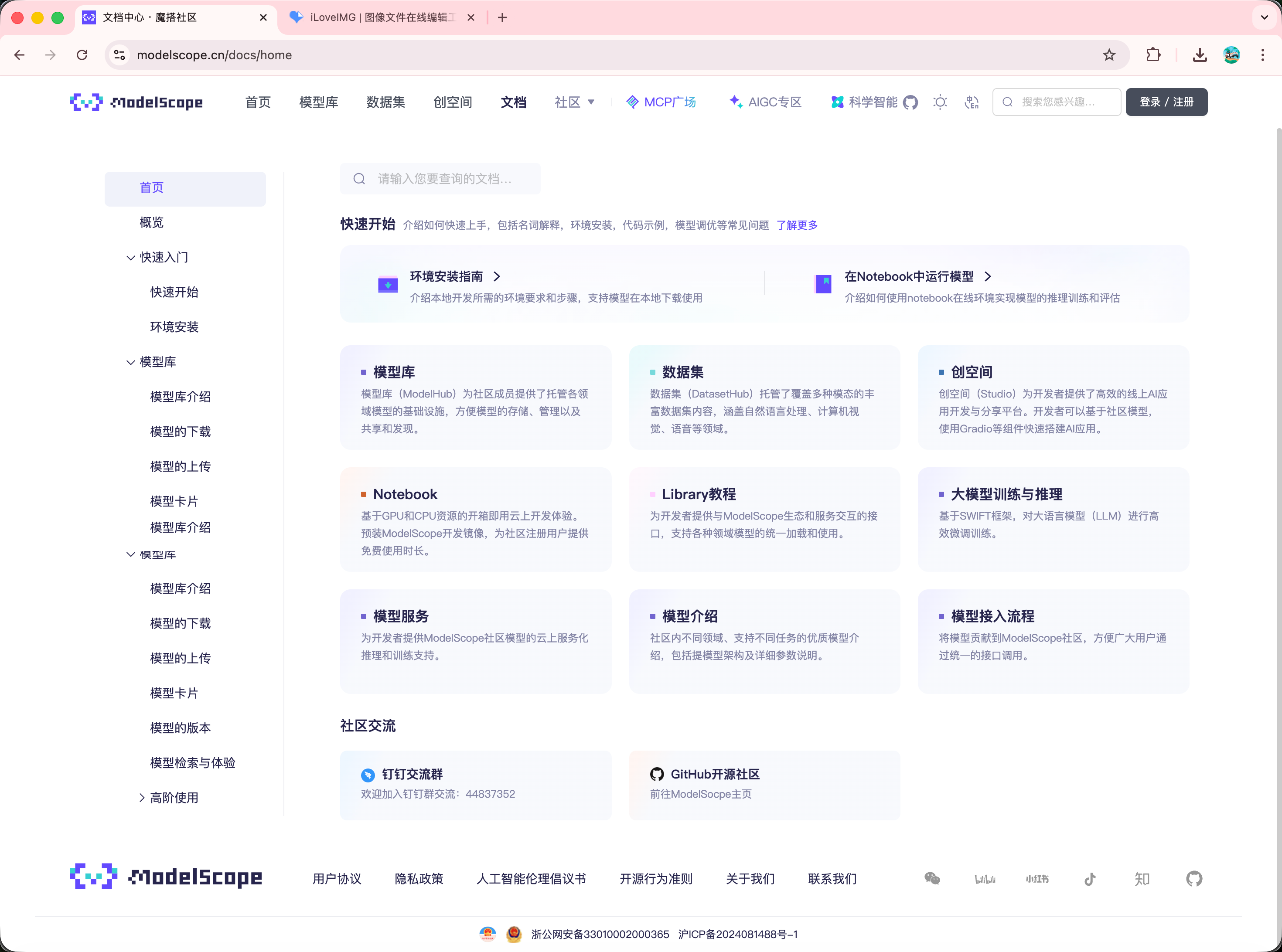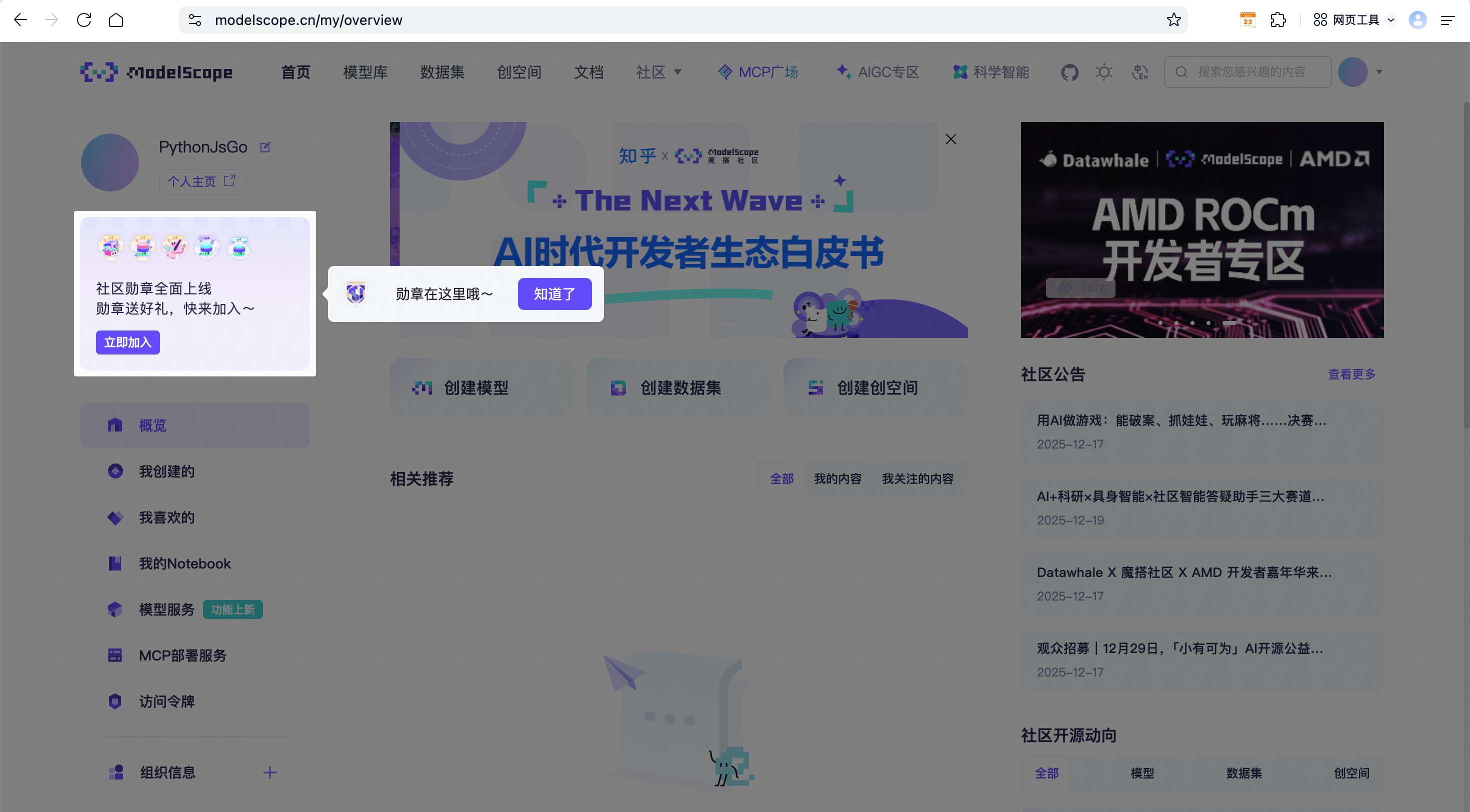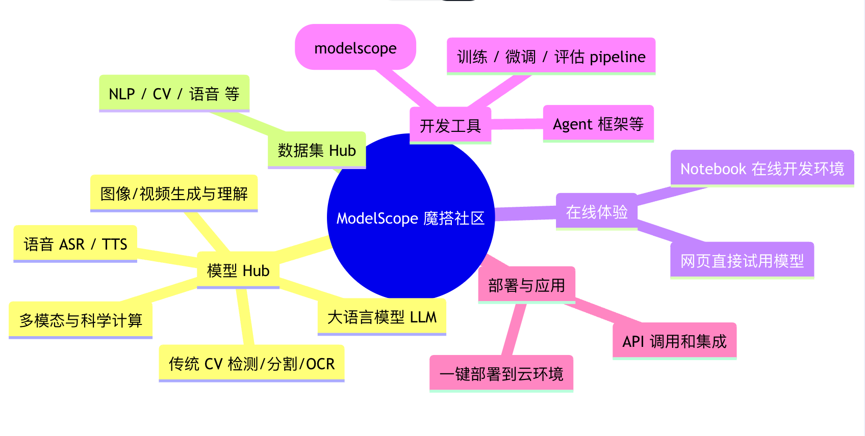 ModelScope(魔搭社区)是由阿里巴巴达摩院(通义实验室) 与与中国计算机学会(CCF)开源发展委员会于 2022 年联合发起的AI 模型即服务(MaaS)平台,被誉为 "中国版 Hugging Face" 或 "AI 模型的 GitHub"ModelScope。其核心理念是Model-as-a-Service(模型即服务),致力于降低 AI 应用开发门槛,提供从模型探索、训练到部署的全生命周期管理。