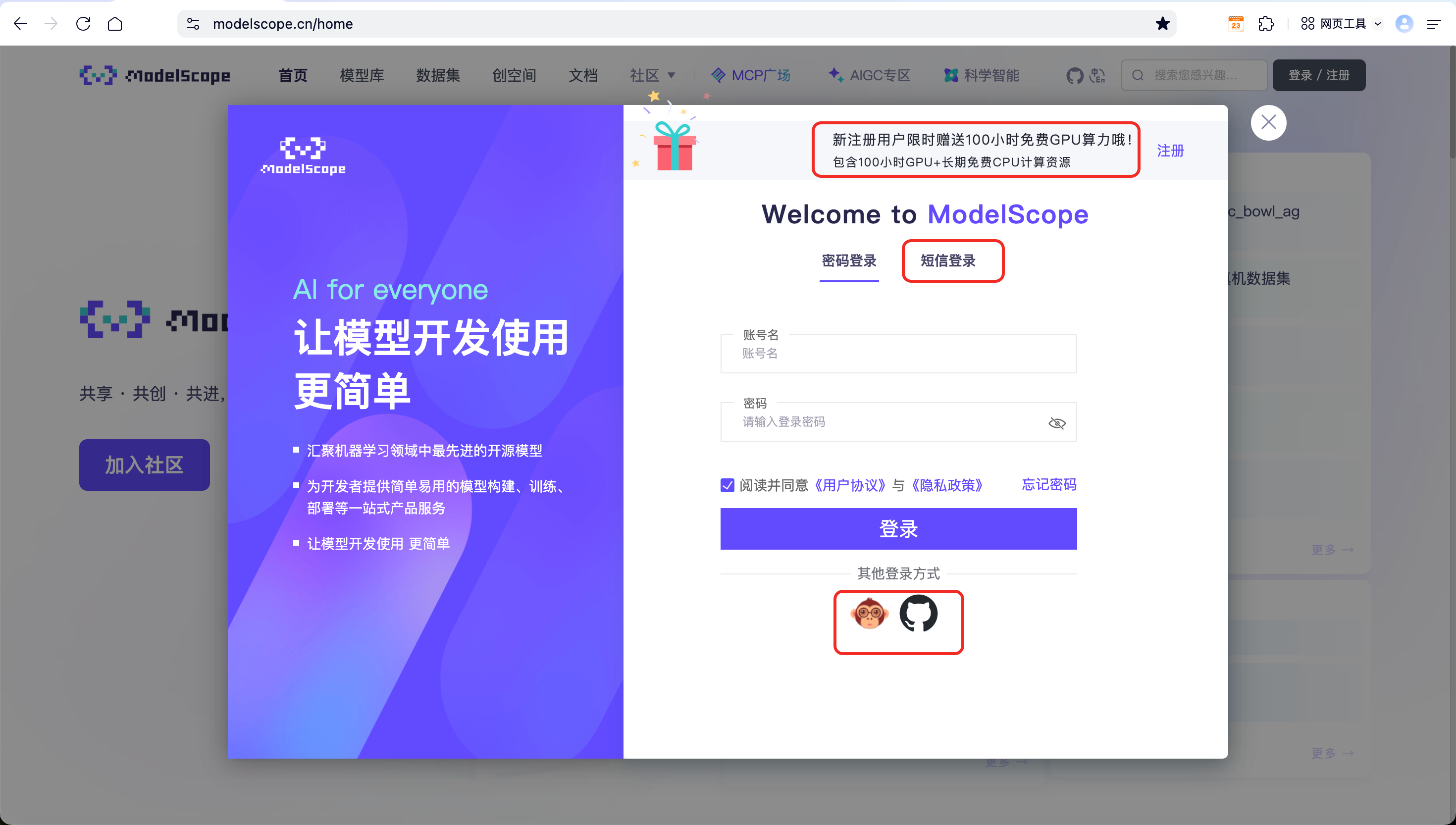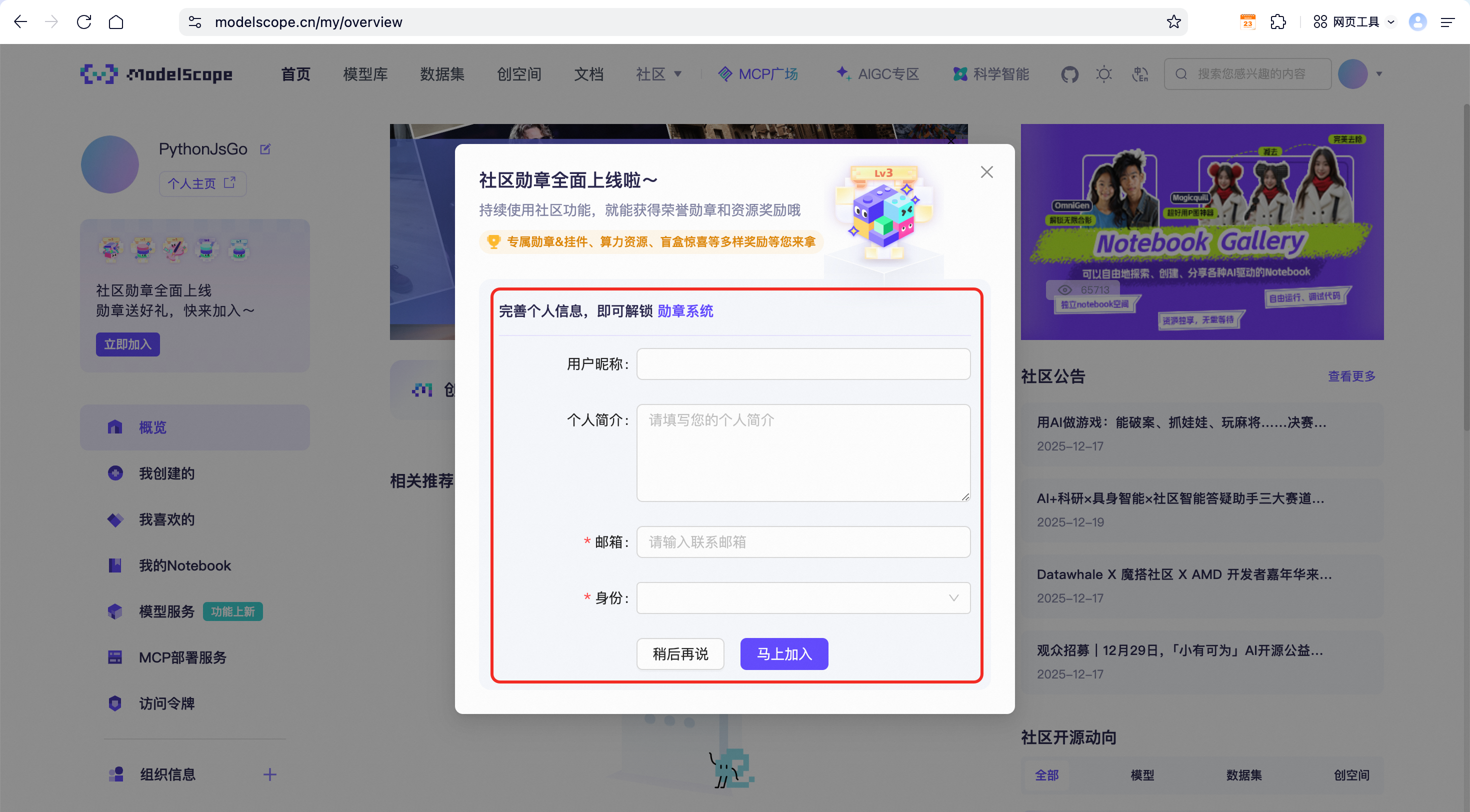 首先,打开魔搭社区官网(https://modelscope.cn),点击右上角的"注册"按钮,填写相关信息完成注册或直接登录(已注册账号的)。