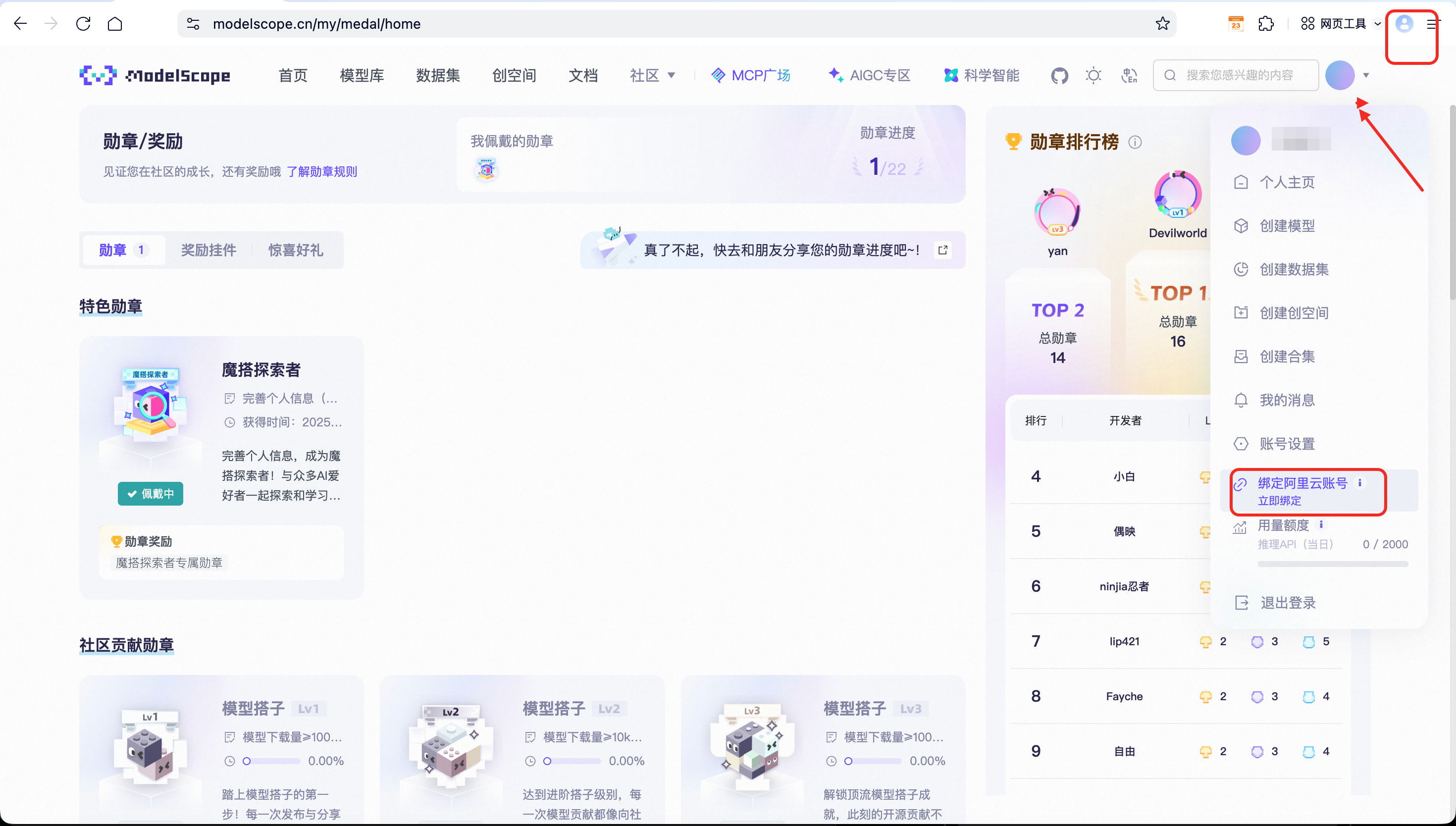 注册成功之后 ,点击右上角的头像。打开下拉菜单,找到菜单"绑定阿里云账号" 然后点击下面的立即绑定。免费推理API由阿里云提供算力支持,要求您的ModelScope账号必须首先绑定阿里云账号。同时为了防止滥用,对应云账号需已通过实名认证后,才可正常使用API-Inference。