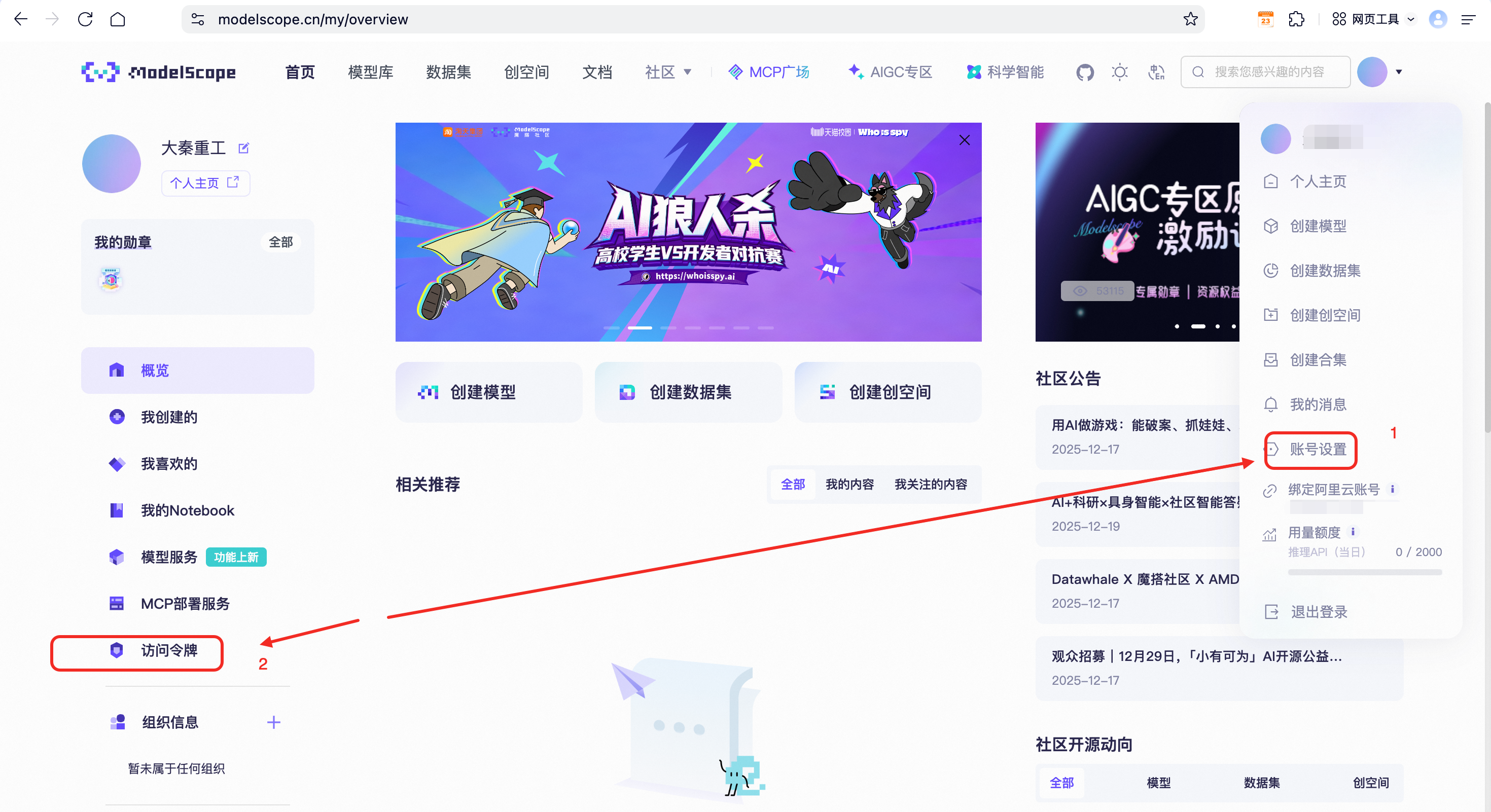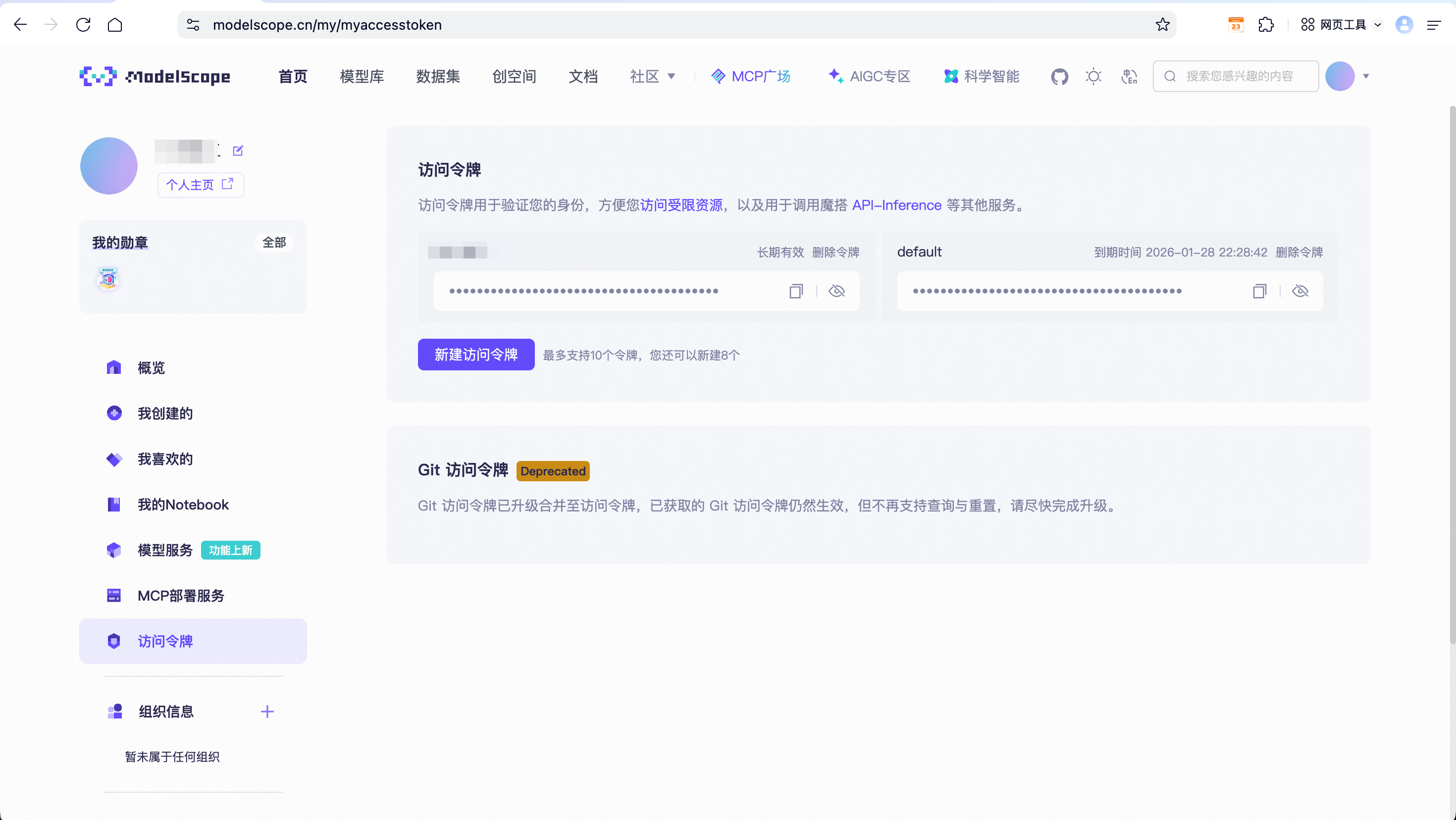 在魔搭的账号设置,点击访问令牌。新建一个临时用的密钥,有了这个密钥之后,就可以接入各种软件了,或者自己基于这个密钥调用魔搭的模型。