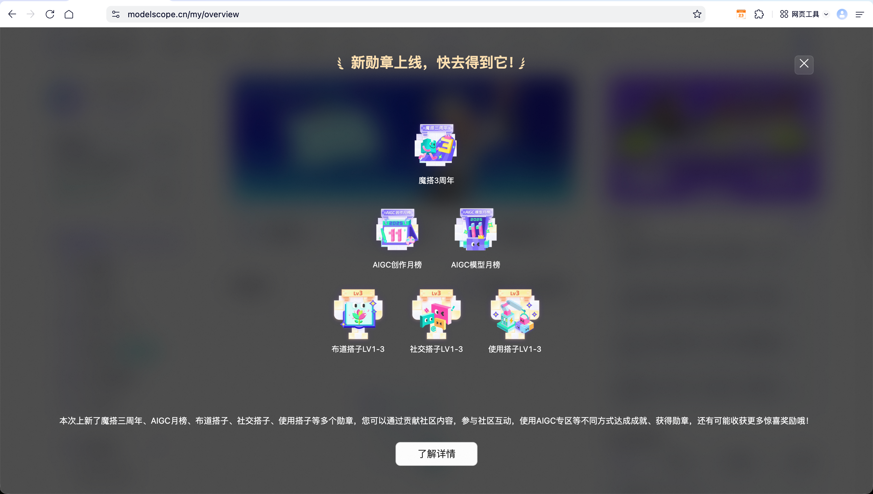 ModelScope 社区成立于 2022 年 6 月,是一个模型开源社区及创新平台,由阿里巴巴通义实验室(Institutefor Intelligent Computing),联合CCF开源发展委员会,共同作为项目发起方。社区联合国内 AI 领域合作伙伴与高校机构,致力于通过开放的社区合作,构建深度学习相关的模型开源社区,并开放相关模型创新技术,推动基于"模型即服务"(Model-as-a-Service)理念的模型应用生态的繁荣发展。
