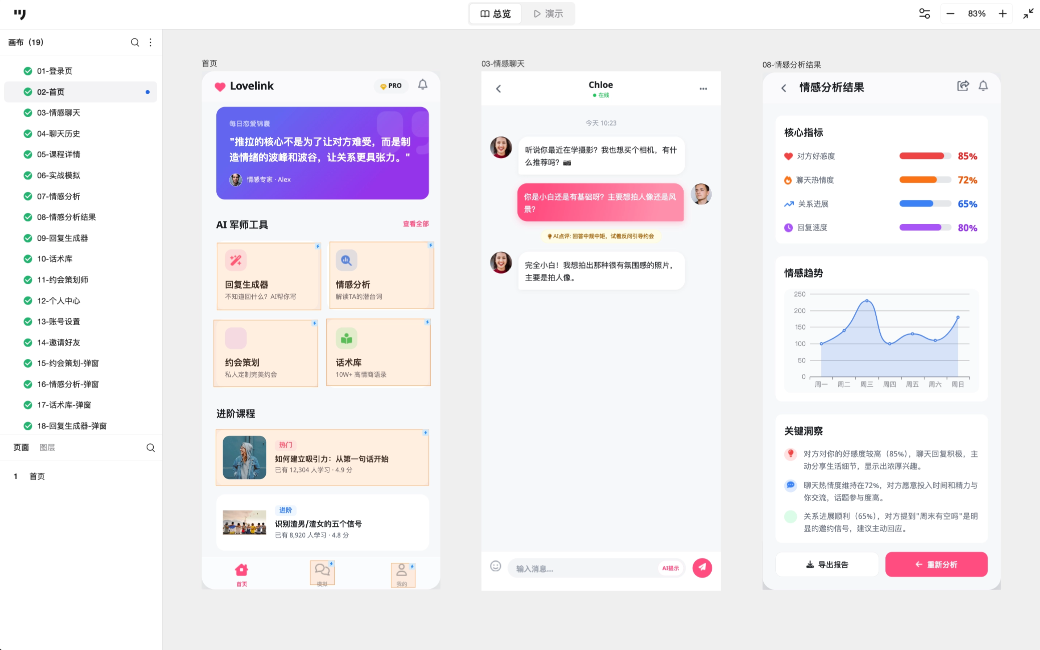 - 情感分析结果页:这里把原本很感性的恋爱关系,拆成了好感度、热情度等几个可理解的指标,再用趋势图和关键建议去解释。加上可视化趋势图与关键洞察建议,让用户像看"体检报告"一样看懂关系进展,非常直观。