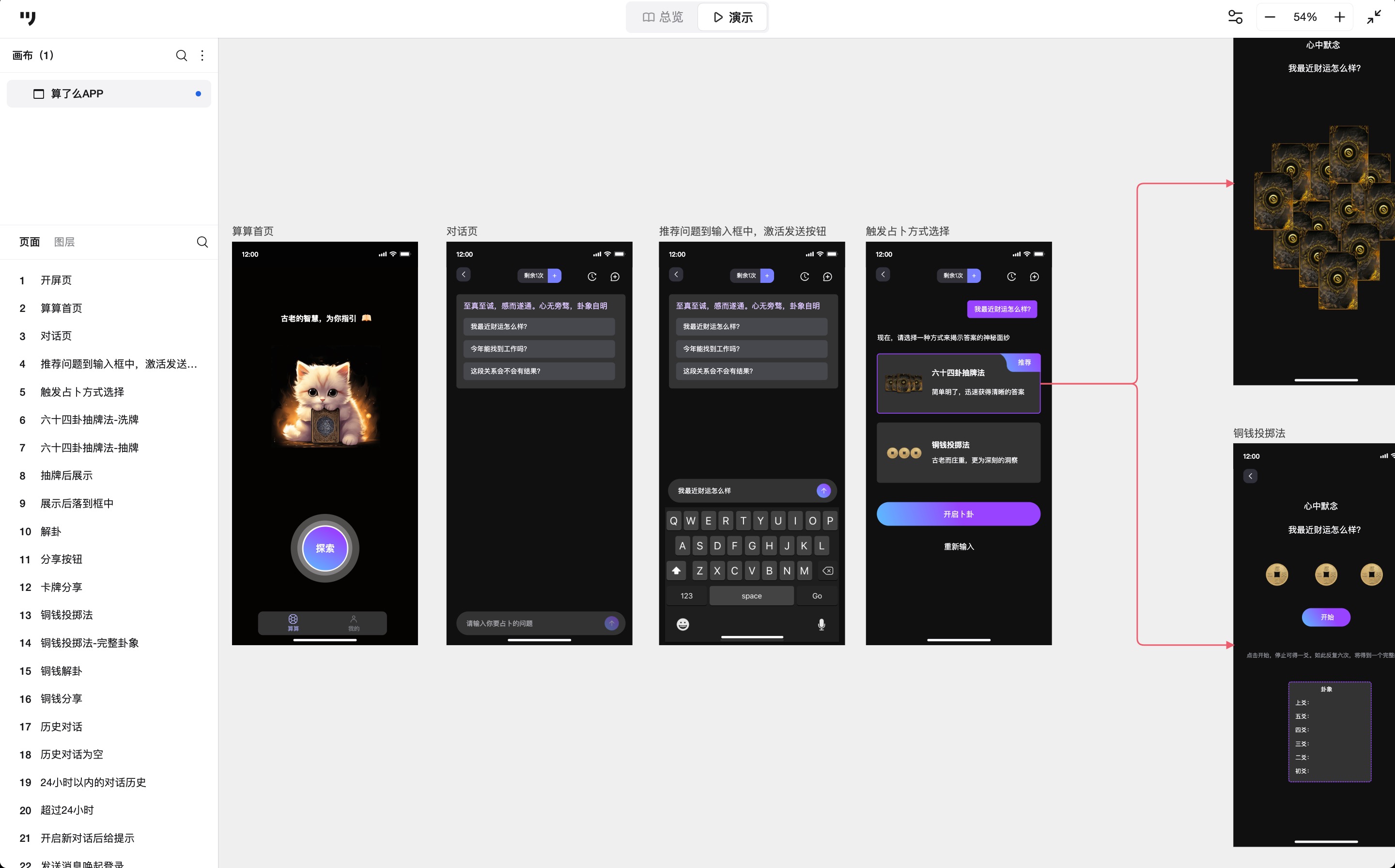 这是一个AI占卜与心理疗愈类APP。基于大模型,对接易经六十四卦,通过对话方式完成占卜和解释,为用户提供"有温度"的运势解析与心理疏导。