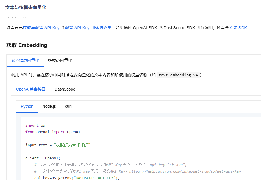 通过代码实验需要用到 Embedding 模型,这里接入的是阿里百炼平台模型。到 阿里百炼https://bailian.console.aliyun.com/ 注册账号后,生成一个 API_KEY 就可以使用了。