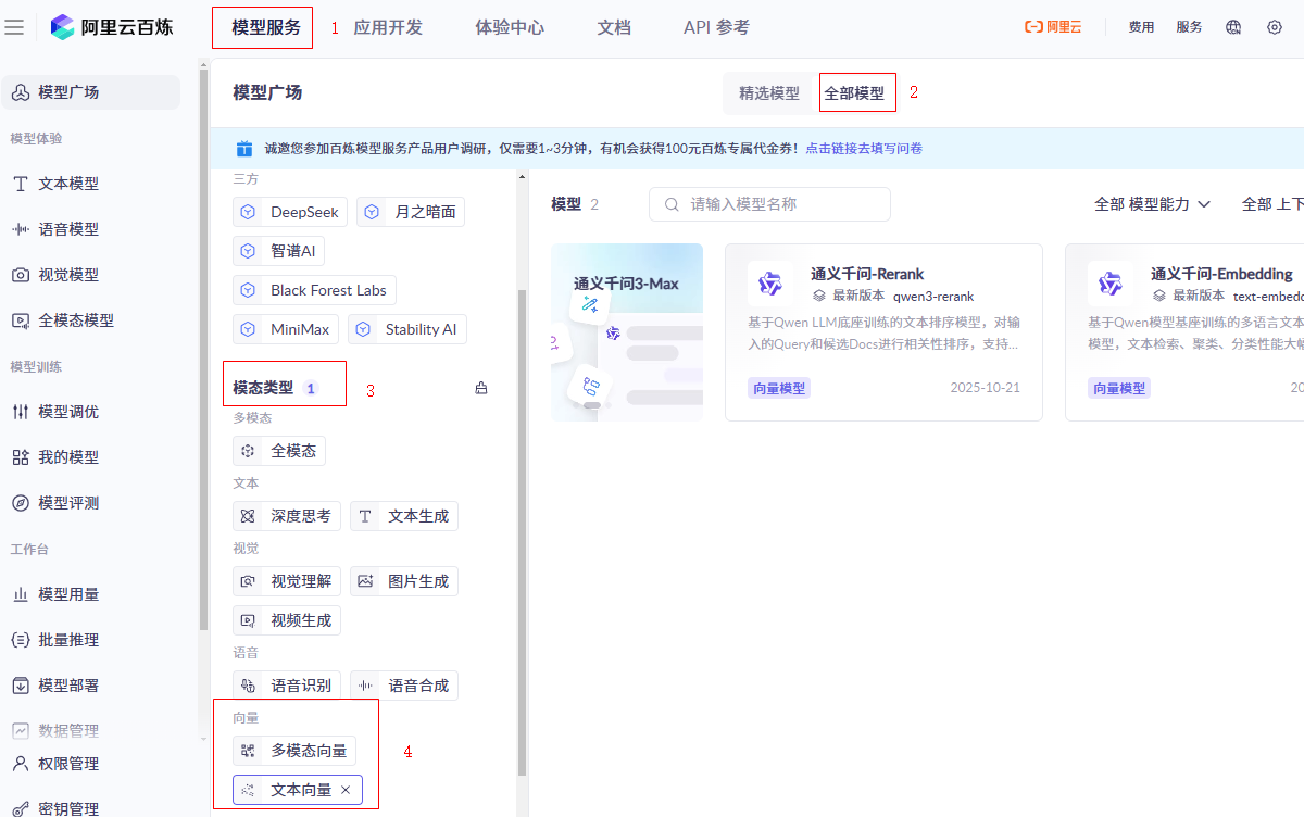 模型服务(在顶部左上角)->全部模型->模态类型 -> 向量 -> 文本向量->[通义千问-Embedding]