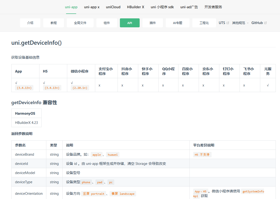 官方文档:https://uniapp.dcloud.net.cn/api/system/getDeviceInfo.html