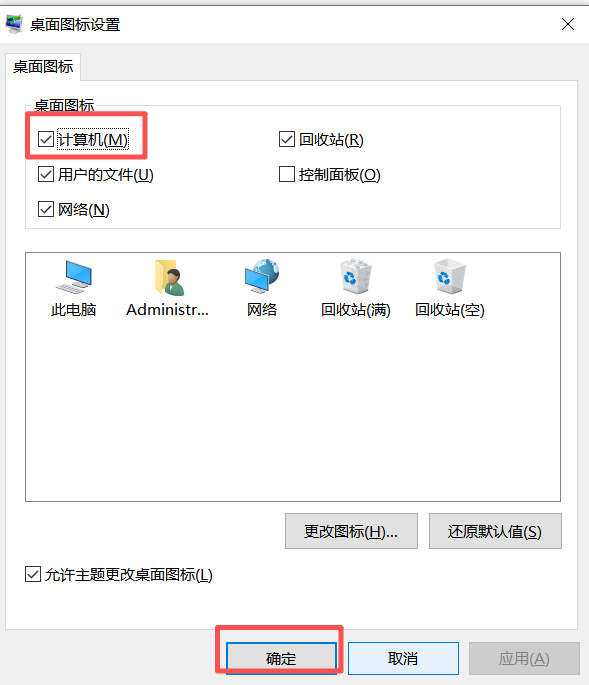 在弹出的桌面图标窗口,把计算机前面的复选框勾选上。其他图标想要谁显示在桌面上勾选即可。如图2所示。