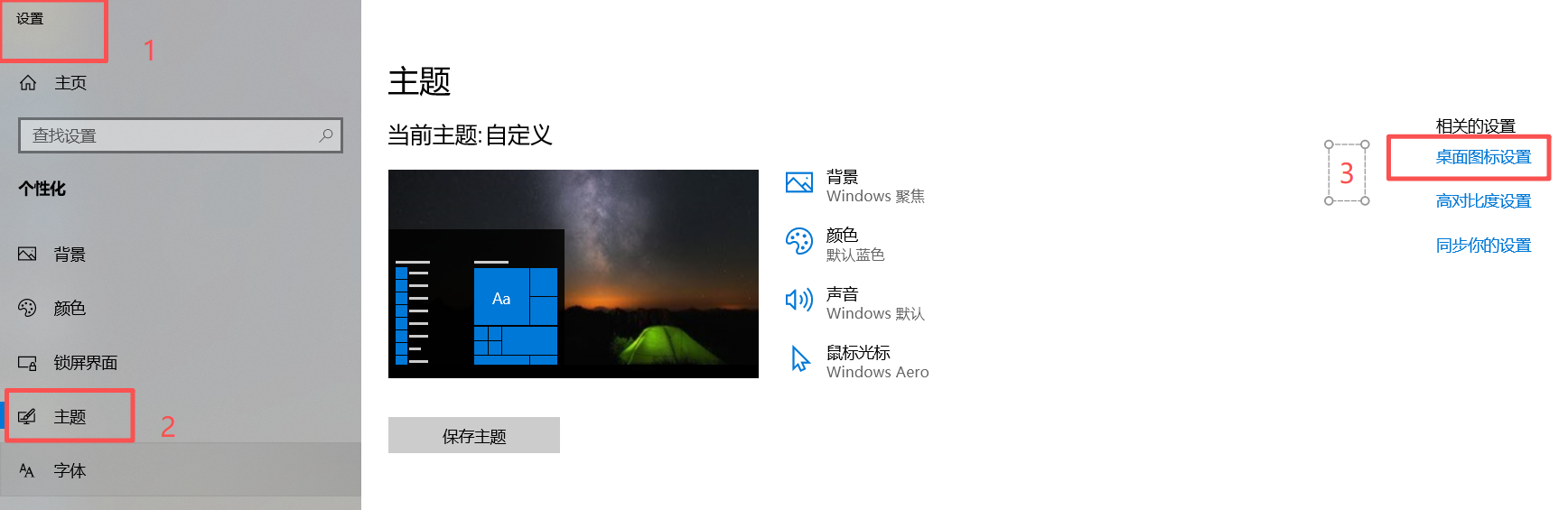 点击电脑设置,选择主题,在主题页面的右侧选择桌面图标设置,如图1所示。
