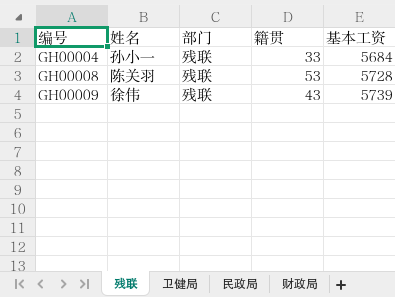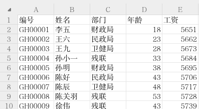 //打印第一次运行结果:"2.财政局,编号,姓名,部门,籍贯,基本工资,GH00001,李五,财政局,18,5651,GH00005,孙明,财政局,38,5695,民政局,编号,姓名,部门,籍贯,基本工资,GH00002,王六,民政局,23,5662,卫健局,编号,姓名,部门,籍贯,基本工资,GH00003,王九,卫健局,28,5673,残联,编号,姓名,部门,籍贯,基本工资,GH00004,孙小一,残联,33,5684"