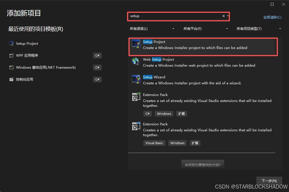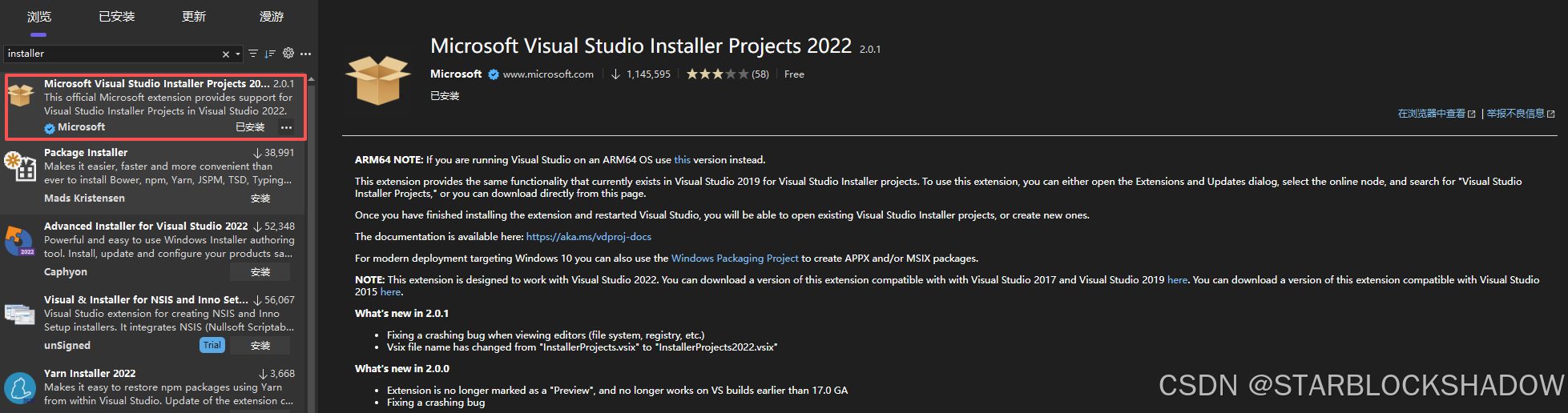 打开VS,选择 扩展→管理扩展→浏览,搜索Installer Projects,点击安装按钮,待安装完成后,重启vs。