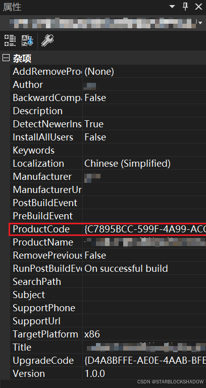其中,{C7895BCC-599F-4A99-ACC3-5A2E0CEB3618} 为 Setup 项目属性中的 ProductCode ,当项目属性中 ProductCode 改变时,此处的 Arguments 值也需要跟着改变)