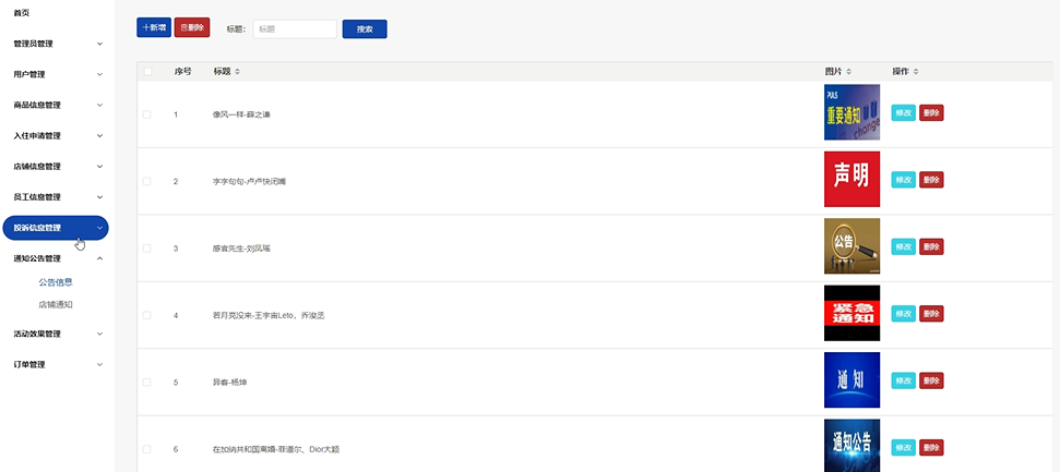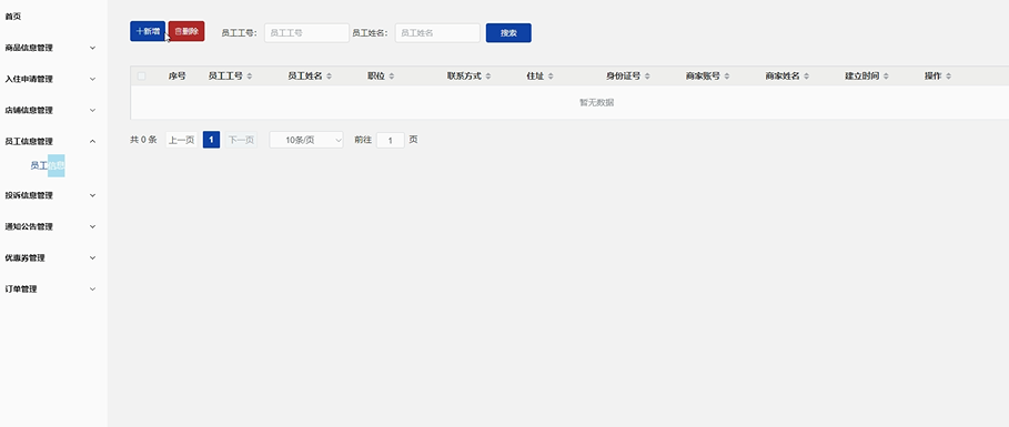 辅助功能:员工信息管理(新增/删除/查询)、店铺通知发布、投诉信息处理、查看通知公告。