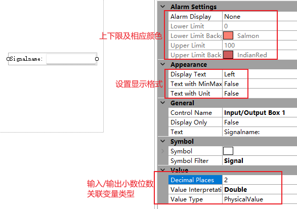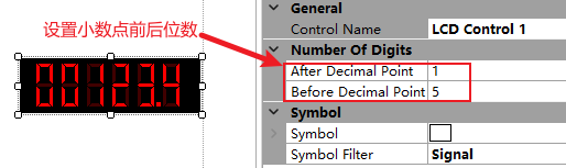 - 该组件的作用是以 LCD 的形式显示关联变量的值,没有输入改变变量值的功能。如下图,需要设置的内容主要有:选择要关联的变量、根据变量取值范围设置好LCD的整数及小数的位数。