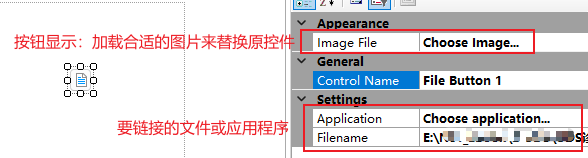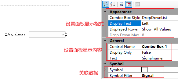 - Panel Designer 的操作界面如下,左侧为控件可关联的信号或变量,中间是控件的放置界面(该区域大小或控件大小都可以通过对角拉缩改变),右侧用于控件参数配置。
