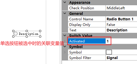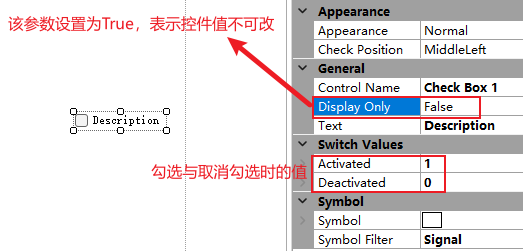 - 其作用与前面的 Button 按钮相似,只不过 Button 控件的状态只在按下时才改变,无法将状态锁住,而控件 Check Box 在勾选后会锁住当前状态。主要设置的参数有:勾选与取消勾选时的值、关联的变量。