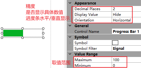 - 其作用是以进度条的形式对关联变量的值进行显示,没有输入改变的功能,与控件 LED Band 功能相似。